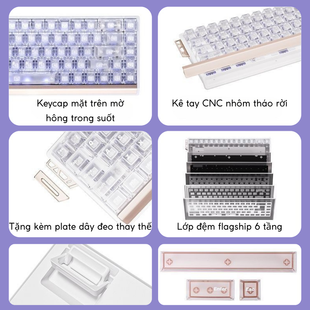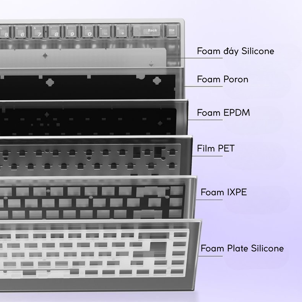 Layout 65% với 68 phím (bao gồm các phím điều hướng phụ, thường phù hợp cho gaming + làm việc); cấu trúc tray-mount; plate bằng nhôm giúp tăng độ cứng và độ ổn định. |