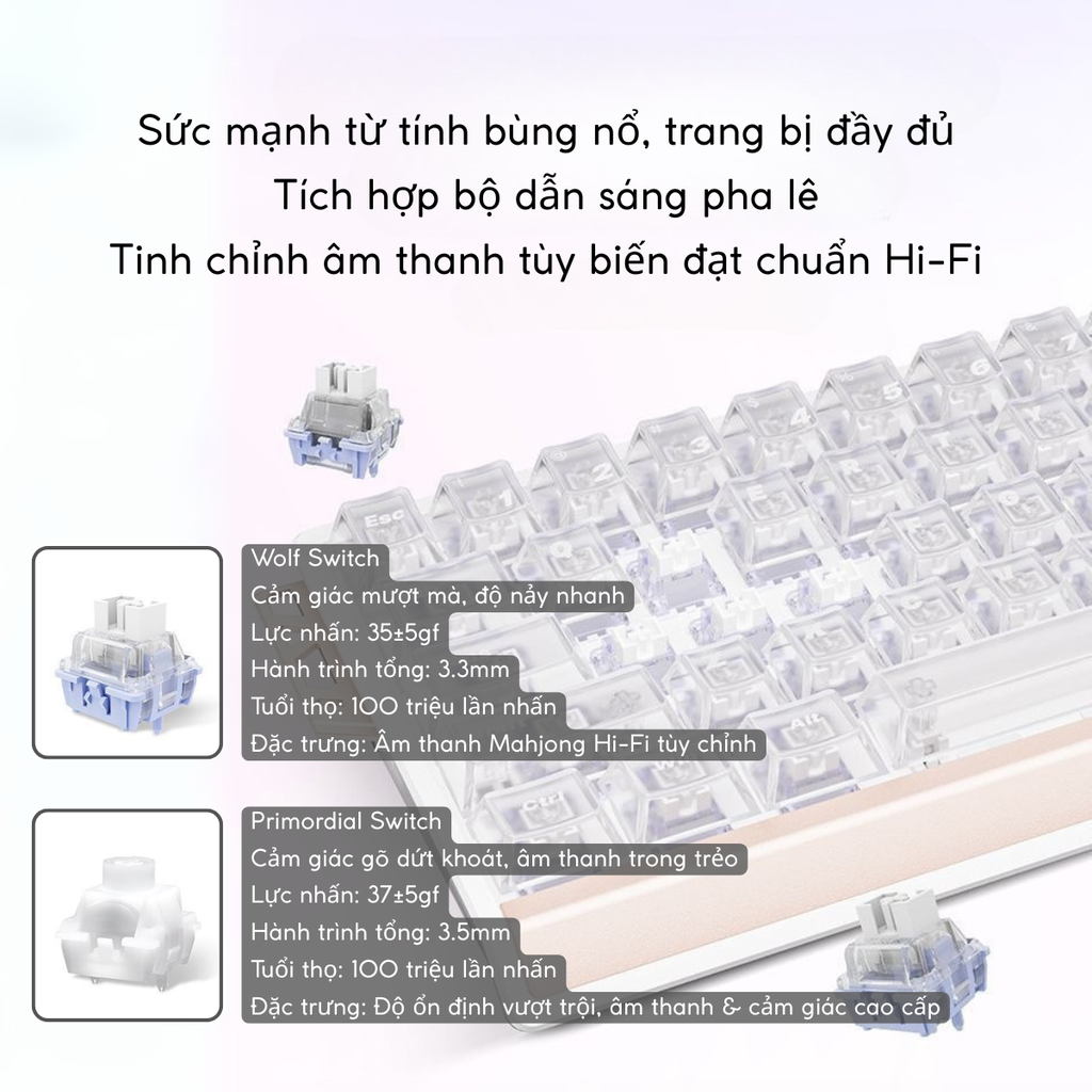 Có hai loại switch: Wolf và Primordial, mỗi loại đi kèm các biến thể màu sắc (White, Black, Pink). Cho hiệu suất gõ ổn định, cảm giác riêng biệt. |