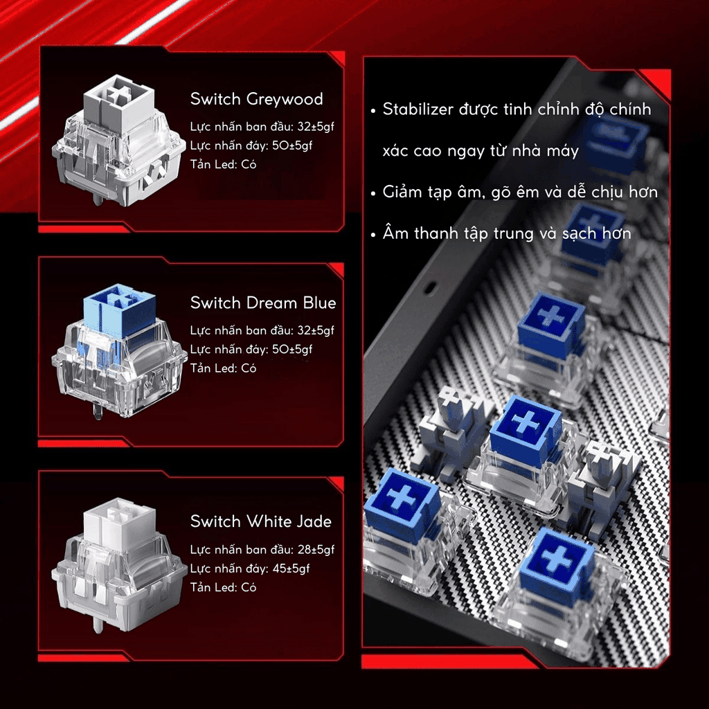 Switch từ tính đa dạng: Lựa chọn Greywood, White Jade, Dream Blue, mang cảm giác gõ khác biệt, êm ái và bền bỉ.