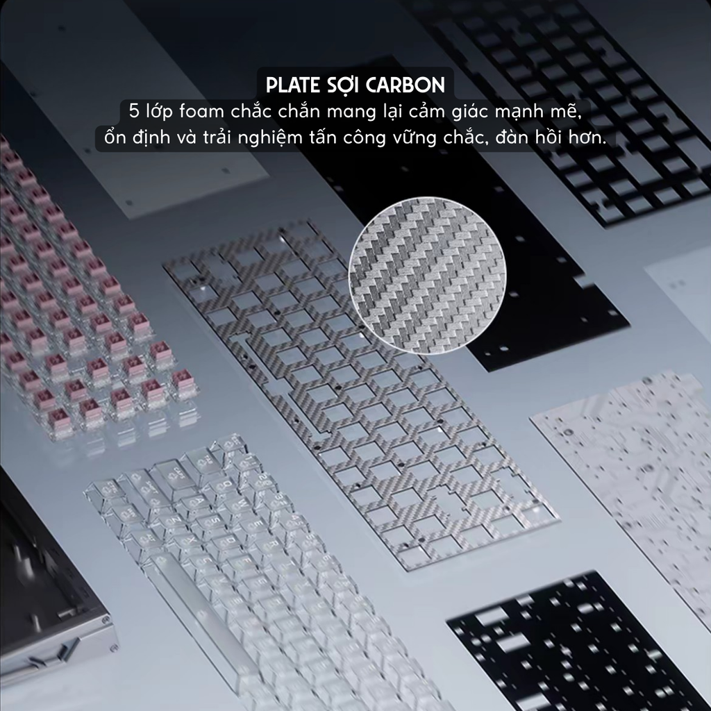 Cấu trúc: Khung nhôm nguyên khối CNC, plate carbon, 6 lớp foam giảm âm