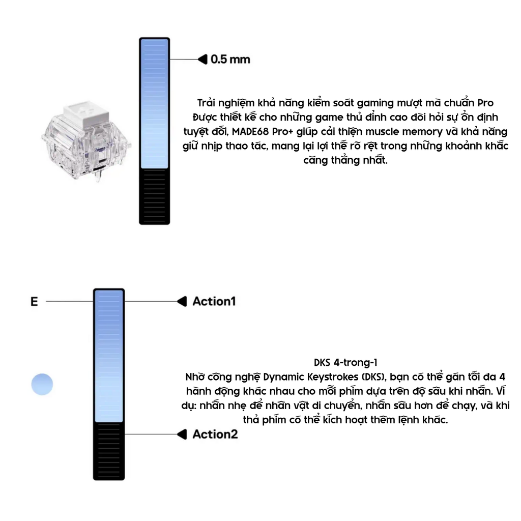 Gán tối đa 4 hành động cho một phím dựa trên độ sâu nhấn – thao tác phức tạp chỉ với một phím.