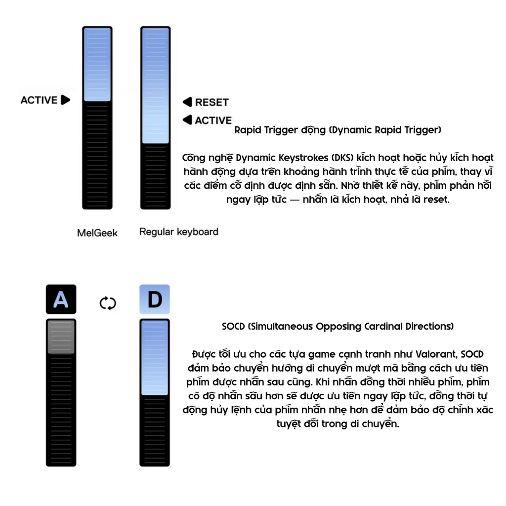 Phản hồi theo hành trình thực tế của phím, mang lại cảm giác kiểm soát liền mạch trong giao tranh tốc độ cao.