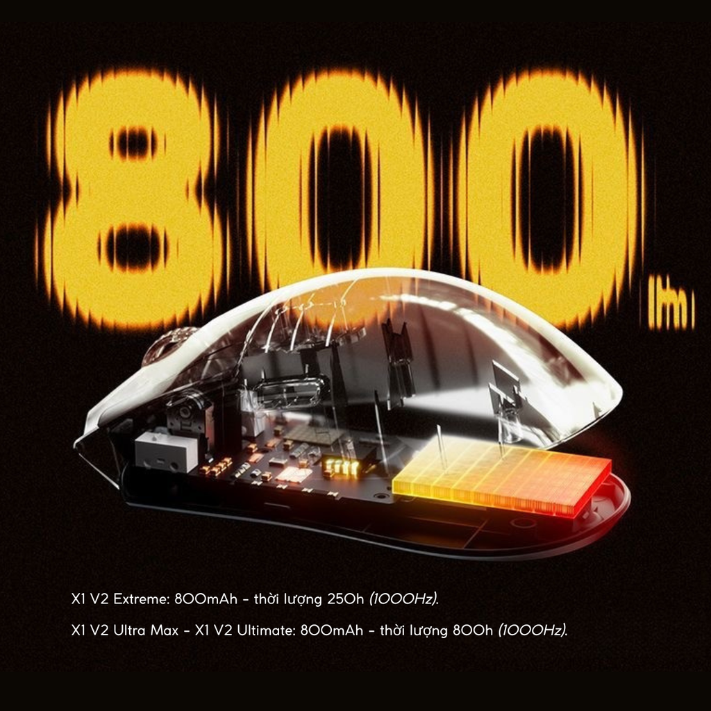 Dung lượng pin 800mAh, cho thời lượng sử dụng lên tới 800+ giờ (ở 1000Hz) hoặc 265+ giờ (ở 8000Hz).