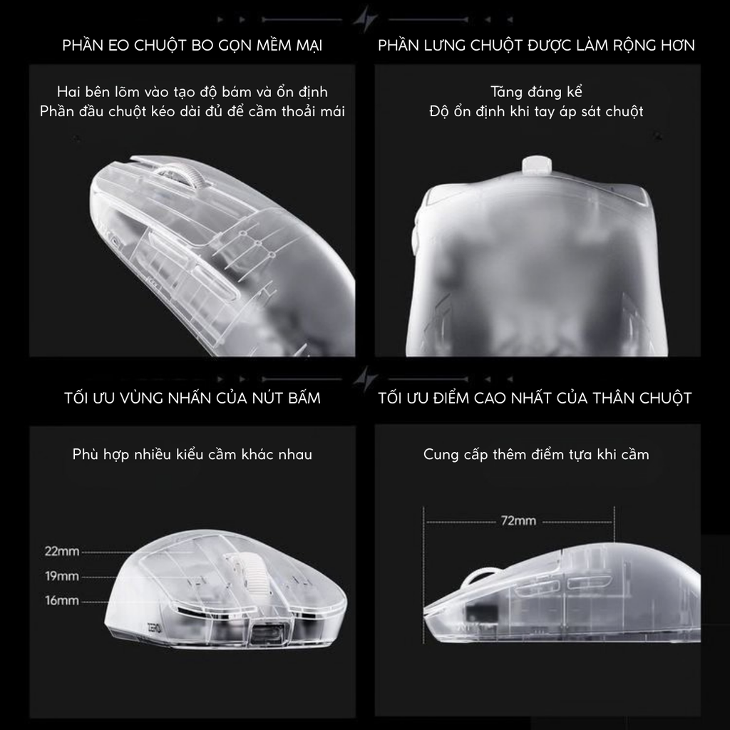Form chuột trước thấp – sau cao tối ưu cho các kiểu cầm Claw Grip và Relaxed Claw, mang lại khả năng kiểm soát tốt khi flick và tracking trong các tựa game FPS.