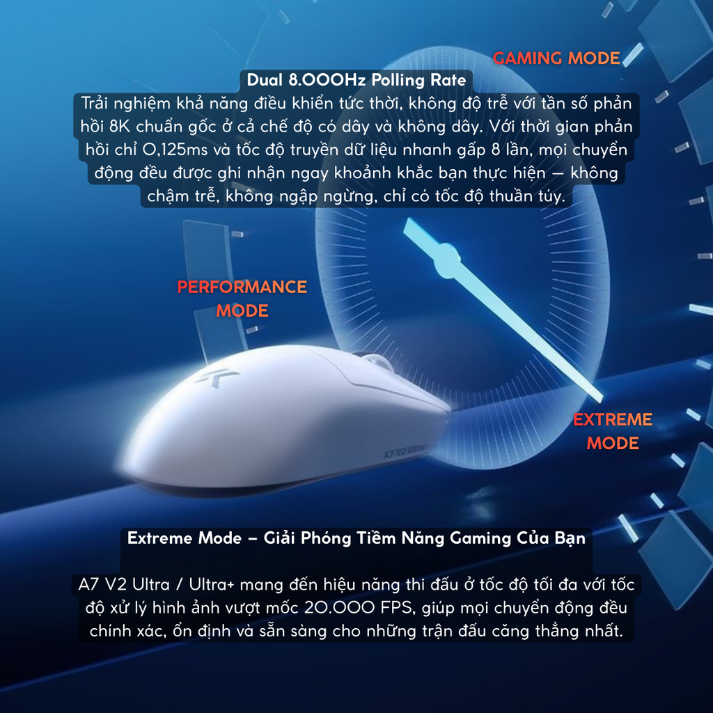 Nếu bạn đang tìm một chiếc chuột gaming không dây hiệu năng cao, thời gian phản hồi gần như bằng 0, độ chính xác tuyệt đối và thiết kế tối ưu cho mọi kiểu cầm — MCHOSE A7 V2 Series là lựa chọn hoàn hảo. Dòng sản phẩm nâng cấp toàn diện với trọng tâm tối ưu, click sắc nét, cảm biến hàng đầu PAW3950 TI và tần số phản hồi lên đến Dual 8K.