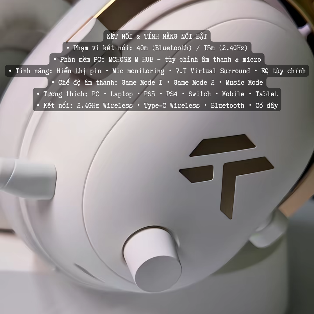 MCHOSE V9 Turbo là tai nghe gaming không dây cao cấp trang bị driver 60mm mạnh mẽ, đế sạc từ tính RGB, độ trễ siêu thấp và micro AI khử ồn. Âm thanh định vị chính xác, đeo thoải mái dài lâu – lựa chọn lý tưởng cho game thủ FPS và người chơi nghiêm túc.